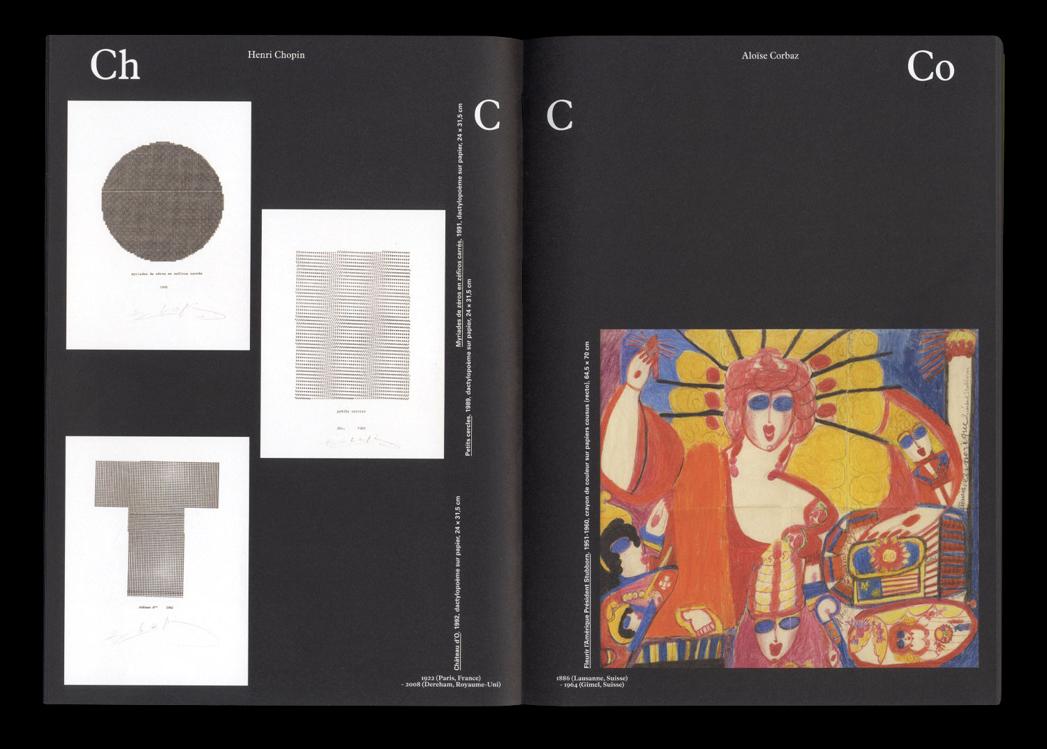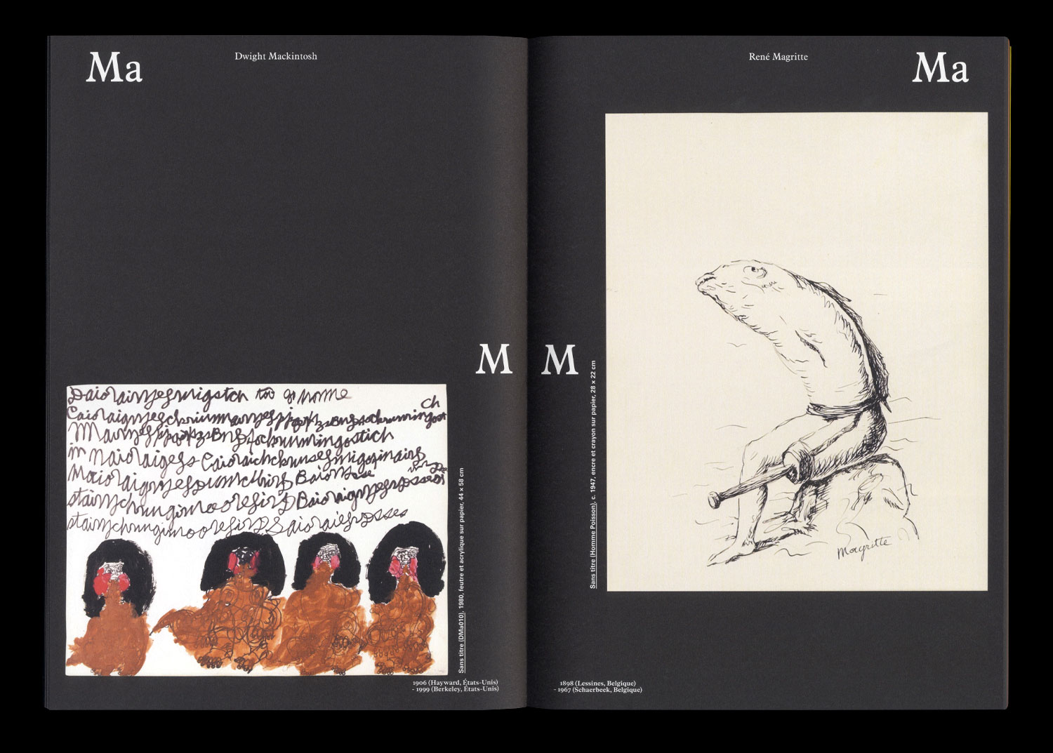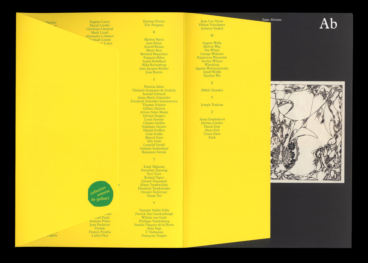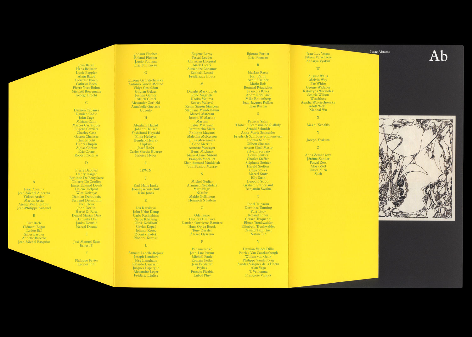 Isaac Abrams, Jean-Michel Alberola, Yüksel Arslan, Martin Assig, Atelier Van Lieshout, Jean-Philippe Aubanel,Bart Baele, Clément Bagot, Ladoo Baï, Gilles Barbier, Annette Barcelo, Jean-Michel Basquiat, Jean Batail, Hans Bellmer, Lucie Beppler, Alain Bizos, Pierrette Bloch, Cathryn Boch, Pierre-Yves Bohm, Michaël Borremans, George Brecht, Damien Cabanes, Damien Cadio, John Cage, Miriam Cahn, Marcos Carrasquer, Eugène Carrière, Charley Case, Gaston Chaissac, chantalpetit, Henri Chopin, Aloïse Corbaz, Éric Corne, Robert Coutelas, Pierre Daboval, Henry Darger, Berlinde De Bruyckere, Thierry De Cordier, James Edward Deeds, Hélène Delprat, Wim Delvoye, Damien Deroubaix, Fernand Desmoulin, Fred Deux, John Devlin, Hervé Di Rosa, Daniel Martin Diaz, Hiroyuki Doi, Janko Domšič, Marcel Dzama, José Manuel Egea, Ernest T., Philippe Favier, Leonor Fini, Johann Fischer, Roland Flexner, Lucio Fontana, Éric Fonteneau, Eugène Gabritschevsky, Antonio Garcia Molino, Vidya Gastaldon, Gilgian Gelzer, Jochen Gerner, Patrick Gimel, Alexander Gorlizki, Annabelle Guetatra, Guyodo, Abraham Hadad, Johann Hauser, Yoshifumi Hayashi, Elika Hedayat, Hendrik Hegray, Hipkiss, Josef Hofer, Carlos Garcia Huergo, Fabrice Hyber, IRWIN, Karl Hans Janke, Foma Jaremtschuk, Kim Jones, Ida Karskaya, John Urho Kemp, Carlo Keshishian, Serge Kliaving, Olrik Kohlhoff, Slavko Kopač, Johann Korec, Zdenek Košek, Noboru Kurosu, Arnaud Labelle-Rojoux, Joseph Lambert, Jörg Langhans, Ricardo Lanzarini, Jacques Lapergue, Alexandre Leger, Frédéric Léglise, Eugène Leroy, Pascal Leyder, Christian Lhopital, Mark Licari, Alexandre Lobanov, Raphaël Lonné, Frédérique Loutz, Dwight Mackintosh, René Magritte, Naoko Majima, Robert Malaval, Kevin Simón Mancera, Stéphane Mandelbaum, Marcel Marceau, Joseph W. Marino, Maryan, Titus Matiyane, Ramuntcho Matta, Philippe Mayaux, Malcolm McKesson, Elina Merenmies, Gene Merritt, Annette Messager, Henri Michaux, Marie-Claire Mitout, François Morellet, Shanthamani Muddaiah, John Bunion Murray, Michel Nedjar, Armineh Negahdari, Marc Negri, Nikifor, Maldo Nollimerg, Heinrich Nüsslein, Oda Jaune, Olivier O. Olivier, Damián Ontiveros Ramírez, Hans Op de Beeck, Tony Oursler, Álvaro Oyarzún, Panamarenko, Jean-Luc Parant, Michail Paule, Romain Pellas, Jean Perdrizet, Peybak, Francis Picabia, Luboš Plný, Étienne Pottier, Éric Pougeau, Markus Raetz, Jean Raine, Arnulf Rainer, Mario Reis, Bernard Réquichot, François Ribes, André Robillard, Mika Rottenberg, Jean-Jacques Rullier, Jean Rustin, Patricia Salen, Thibault Scemama de Gialluly, Arnold Schmidt, Anne-Marie Schneider, Friedrich Schröder-Sonnenstern, Thomas Schütte, Gilbert Shelton, Arturo Simó Masip, Sylvain Sorgato, Louis Soutter, Charles Steffen, Stéphane Steiner, Harald Stoffers, Ceija Stojka, Marcel Storr, Elly Strik, Leopold Strobl, Graham Sutherland, Benjamin Swaim, onel Talpazan, Dorothea Tanning, Yuri Titov, Roland Topor, Gérard Traquandi, Elmar Trenkwalder, Elisabeth Trenkwalder, Oswald Tschirtner, Nasan Tur, Damián Valdés Dilla, Patrick Van Caeckenbergh, Willem van Genk, Philippe Vandenberg, Sandra Vásquez de la Horra, Alan Vega, T. Venkanna, Françoise Vergier, Jean-Luc Verna, Fabien Verschaere, Acharya Vyakul, August Walla, Melvin Way, Pae White, George Widener, Katarzyna Wiesiolek, Scottie Wilson, Winshluss , Agatha Wojciechowsky, Adolf Wölfli, Xiaohai Wu, Mâkhi Xenakis, Joseph Yoakum, Anna Zemánková, Jérôme Zonder, Pascal Zoss, Aloys Zötl, Unica Zürn, Zush