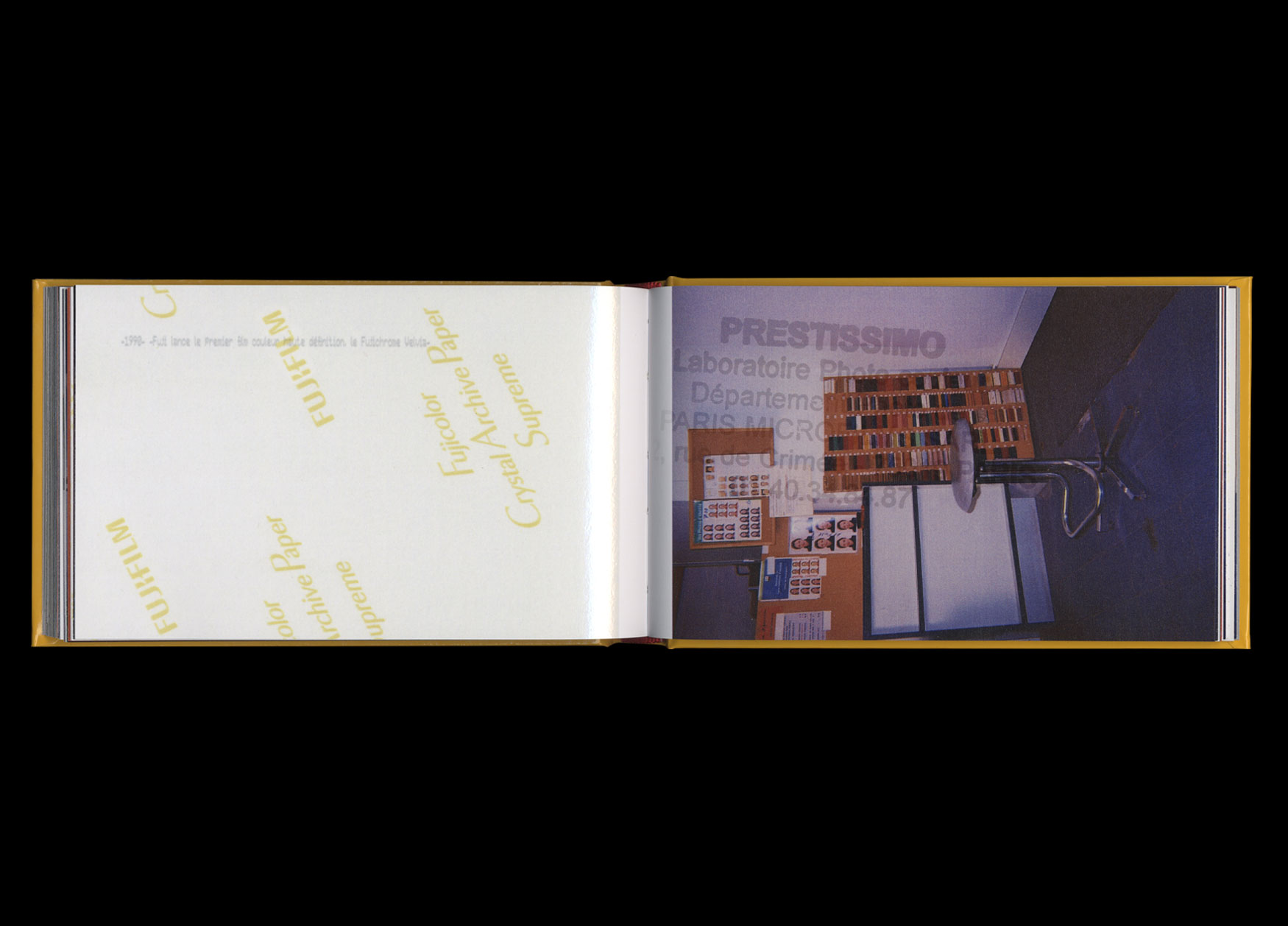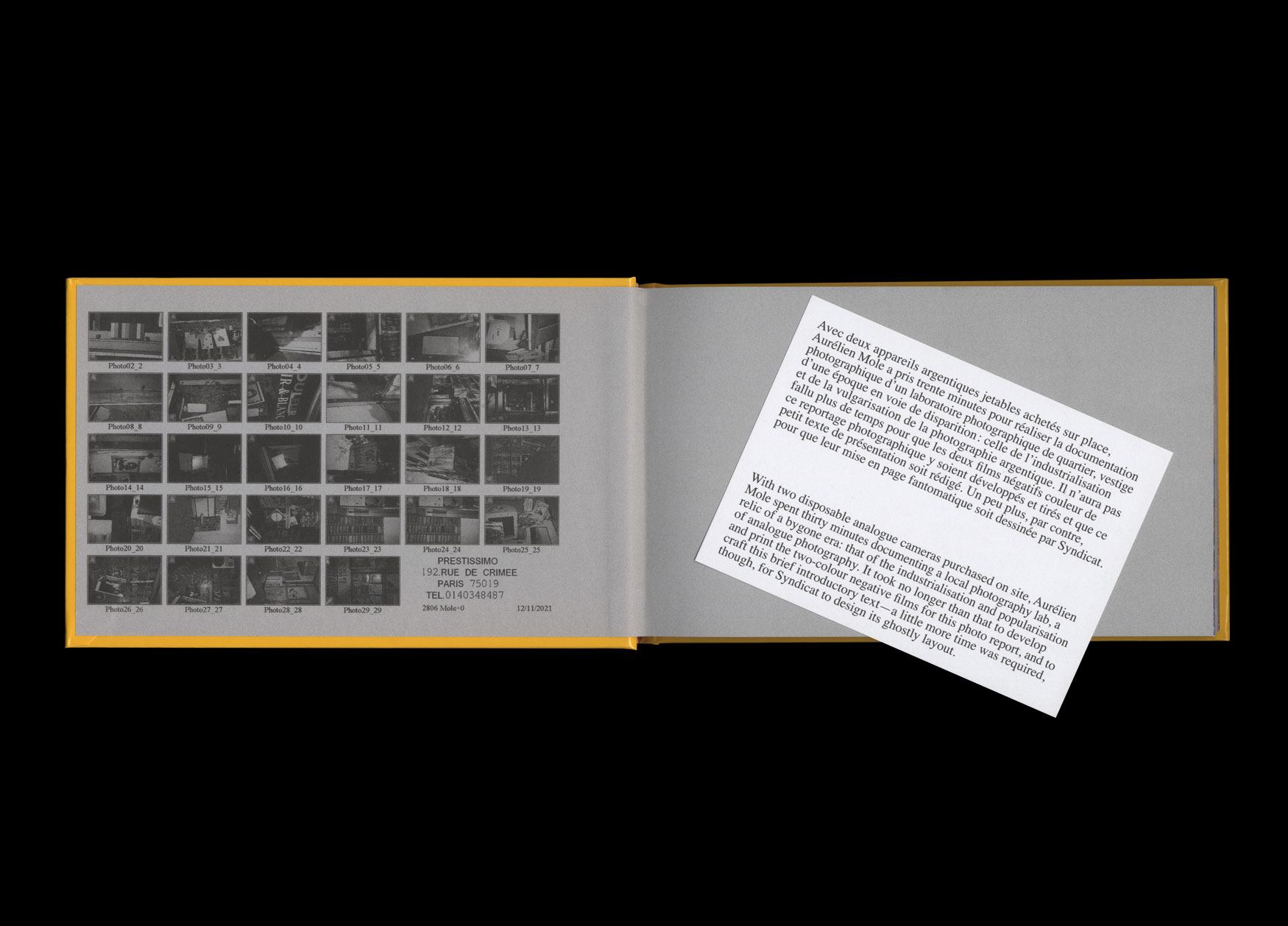 Avec deux appareils argentiques jetables achetés sur place, Aurélien Mole a pris trente minutes pour réaliser la documentation photographique d’un laboratoire photographique de quartier, vestige d’une époque en voie de disparition : celle de l’industrialisation et de la vulgarisation de la photographie argentique. Il n’aura pas fallu plus de temps pour que les deux films négatifs couleur de ce reportage photographique y soient développés et tirés et que ce petit texte de présentation soit rédigé. Un peu plus, par contre, pour que leur mise en page fantomatique soit dessinée par Syndicat.