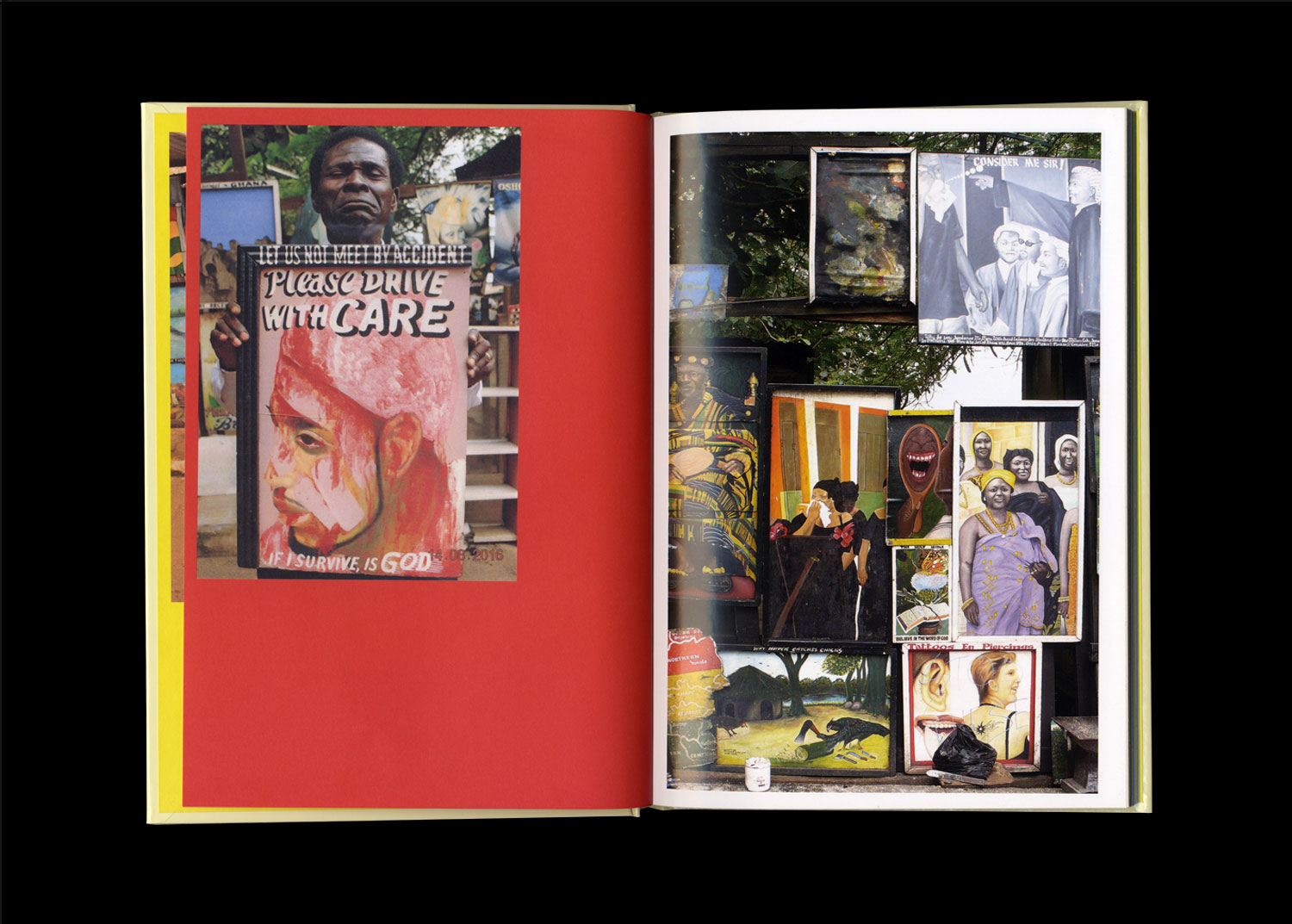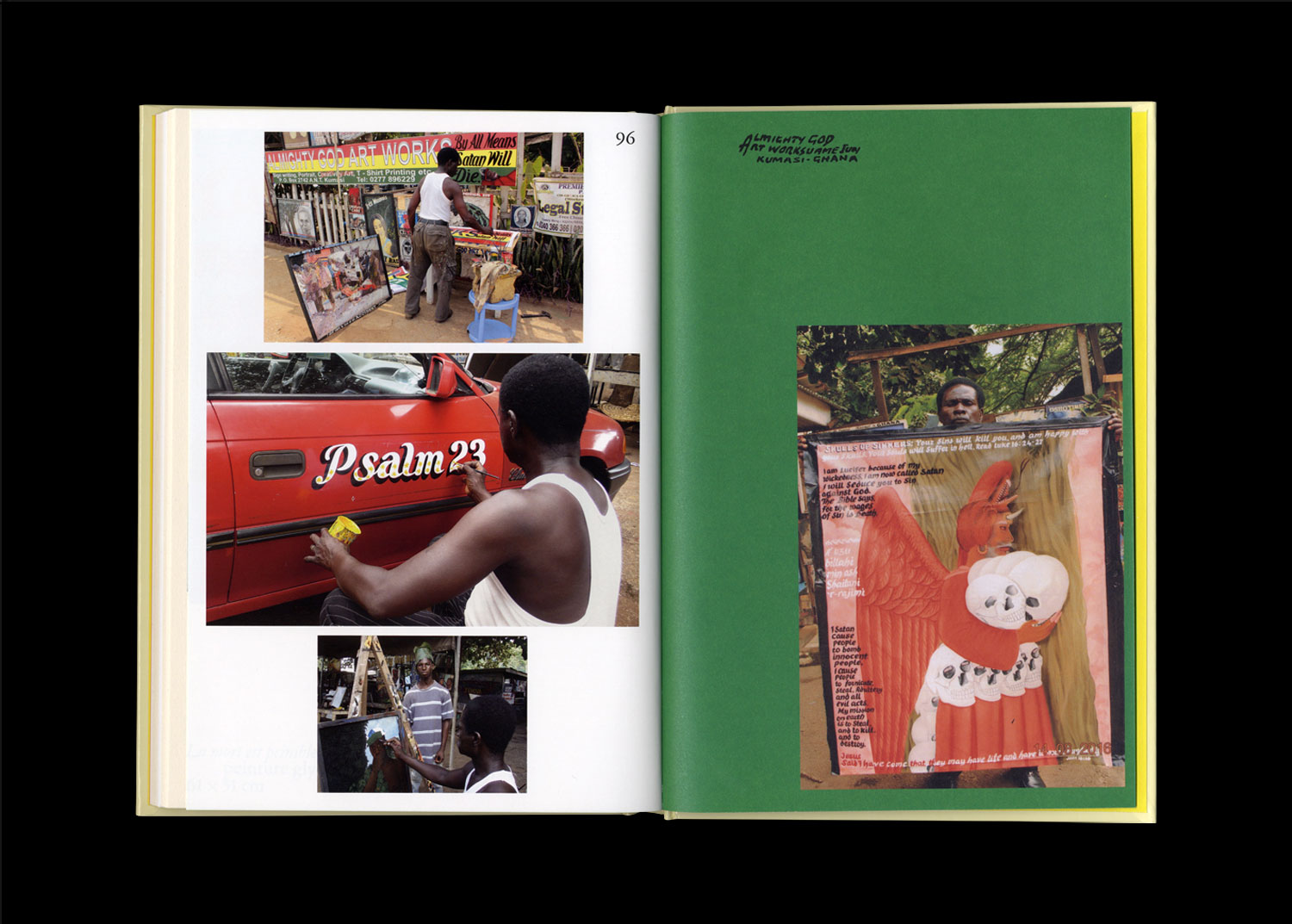 Artiste et prédicateur ghanéen plus connu sous le nom d’Almighty God, Kwame Akoto développe une pratique picturale en parallèle de son activité de peintre d’enseignes depuis le début des années 1970. Cette œuvre prolifique mêle messages spirituels, autoportraits, portraits de célébrités et scènes quotidiennes de Kumasi, la capitale de la région Ashanti où il est établi. Avec une grande maîtrise de la typographie et un sens précis de la formule et de l’image, l’artiste y remercie « Dieu tout-puissant » des grâces qu’il accorde, notamment l’humanité, la nature ou la nourriture, et prêche contre les tentations démoniaques comme la sorcellerie, le paganisme ou encore la cigarette, ennemi public numéro un.