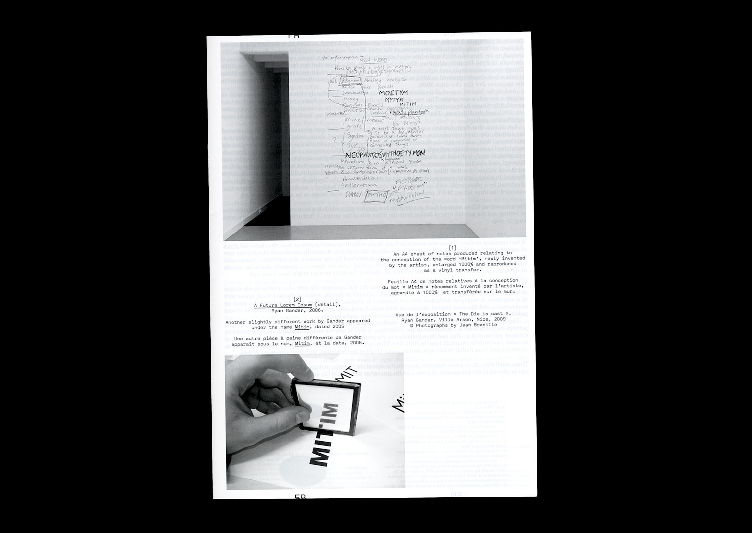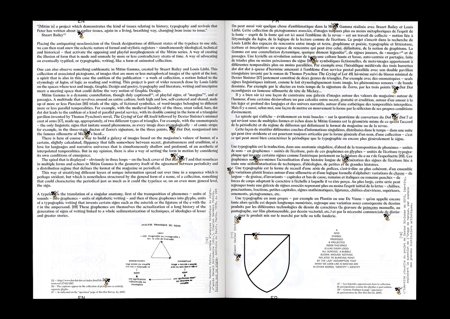 Mitim. A spun figure of a triangle that calls on asterism, a constellation of stars that is the figure of the constitution of meaning, at the same time being the typographical sign of changing paragraphs, or tailpiece. A prolific sign of rupture and continuation that marks the condition of every text and any periodical publication. A sign that proposes, in its form of a horizontal line of stars, an equivalent of the ellipsis, or “dot dot dot” as it is more commonly known.