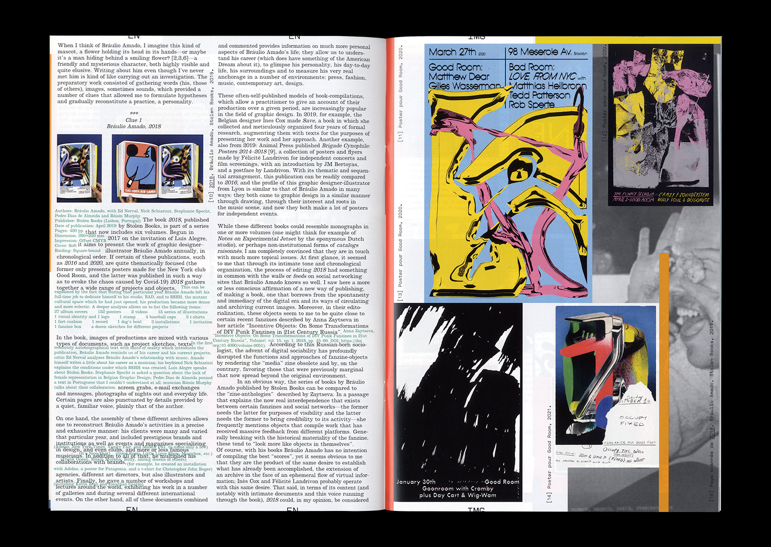 Écrire à propos d’une personne que l’on n’a jamais rencontrée, c’est en quelque sorte mener une enquête. Le travail préparatoire consiste à collecter des mots (les siens, ceux d’autres), des images, parfois des sons, qui sont autant d’indices permettant de se projeter, de formuler des hypothèses. En somme, c’est tenter de comprendre et de reconstituer au fil du temps une personnalité, une pratique, et finalement un territoire. Mon enquête sur Bráulio Amado commence en janvier dernier, par l’acquisition de son ouvrage 2018 sur le site de l’éditeur portugais Stolen Books. Elle se poursuit ensuite sur plusieurs mois, durant lesquels je me trouve tour à tour transportée dans les sous-sols de clubs, dans les scènes musicales lisboètes ou new-yorkaises, puis au sein des colonnes d’un hebdomadaire américain consacré à l’économie, pour terminer au cœur d’une certaine relation entre l’historique affichiste et le très actuel graphiste-illustrateur.