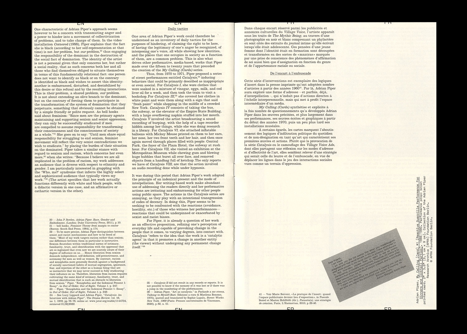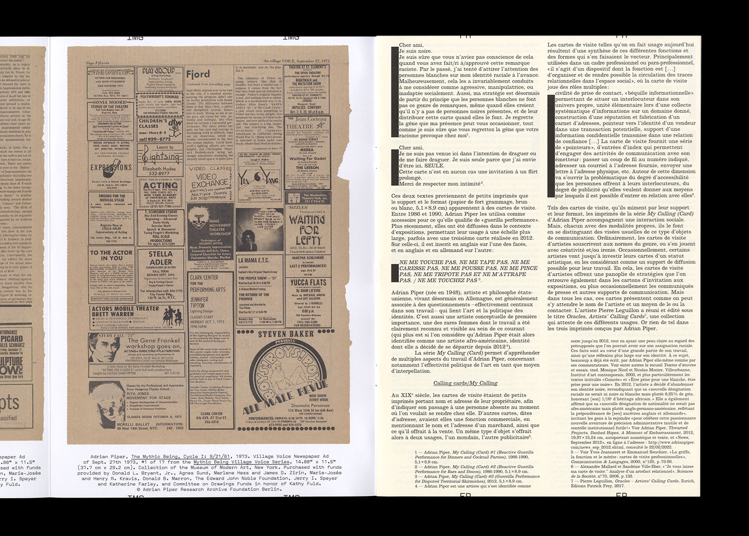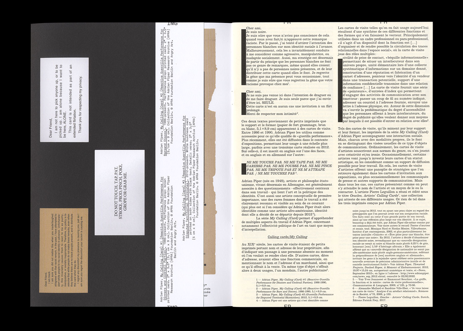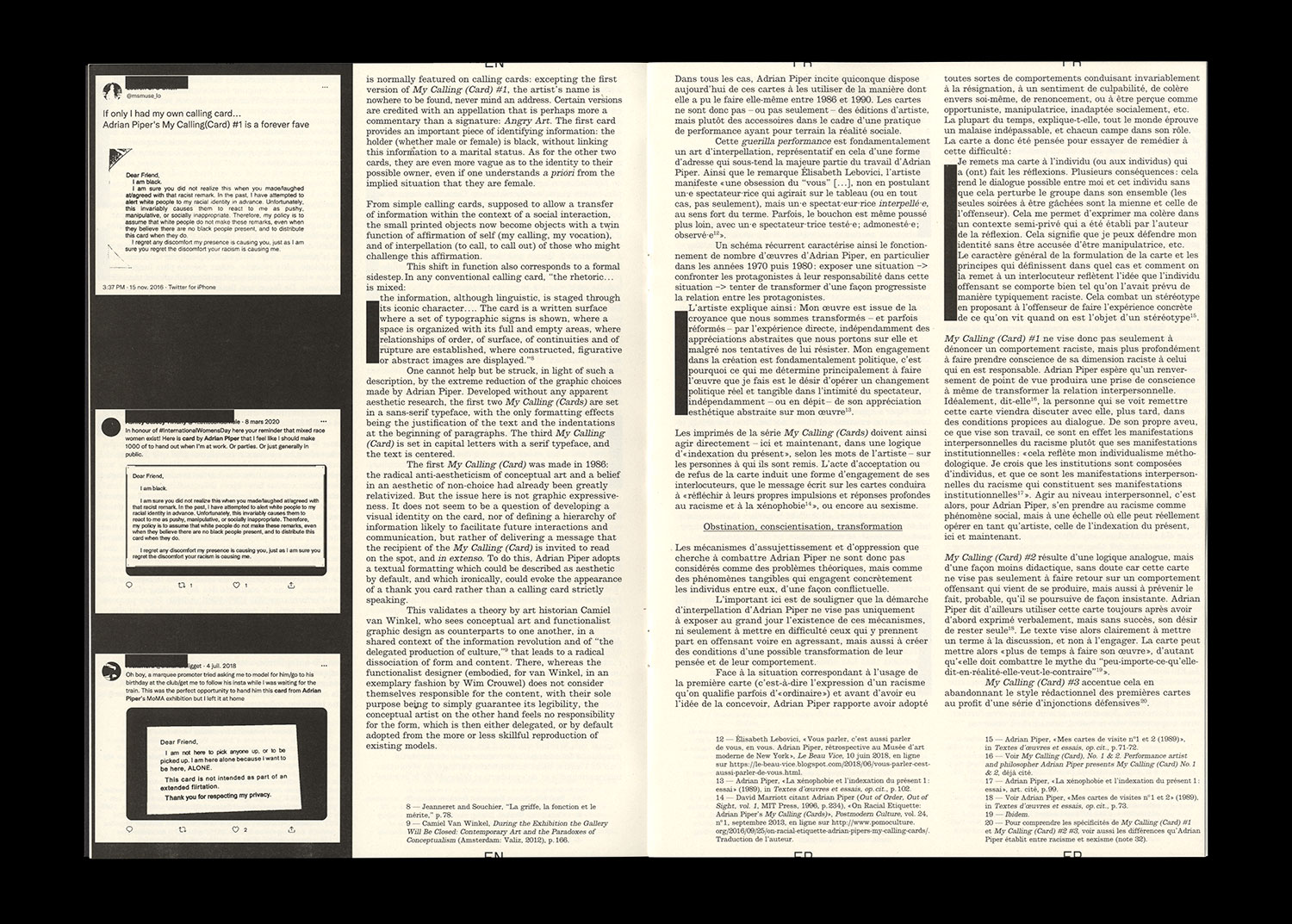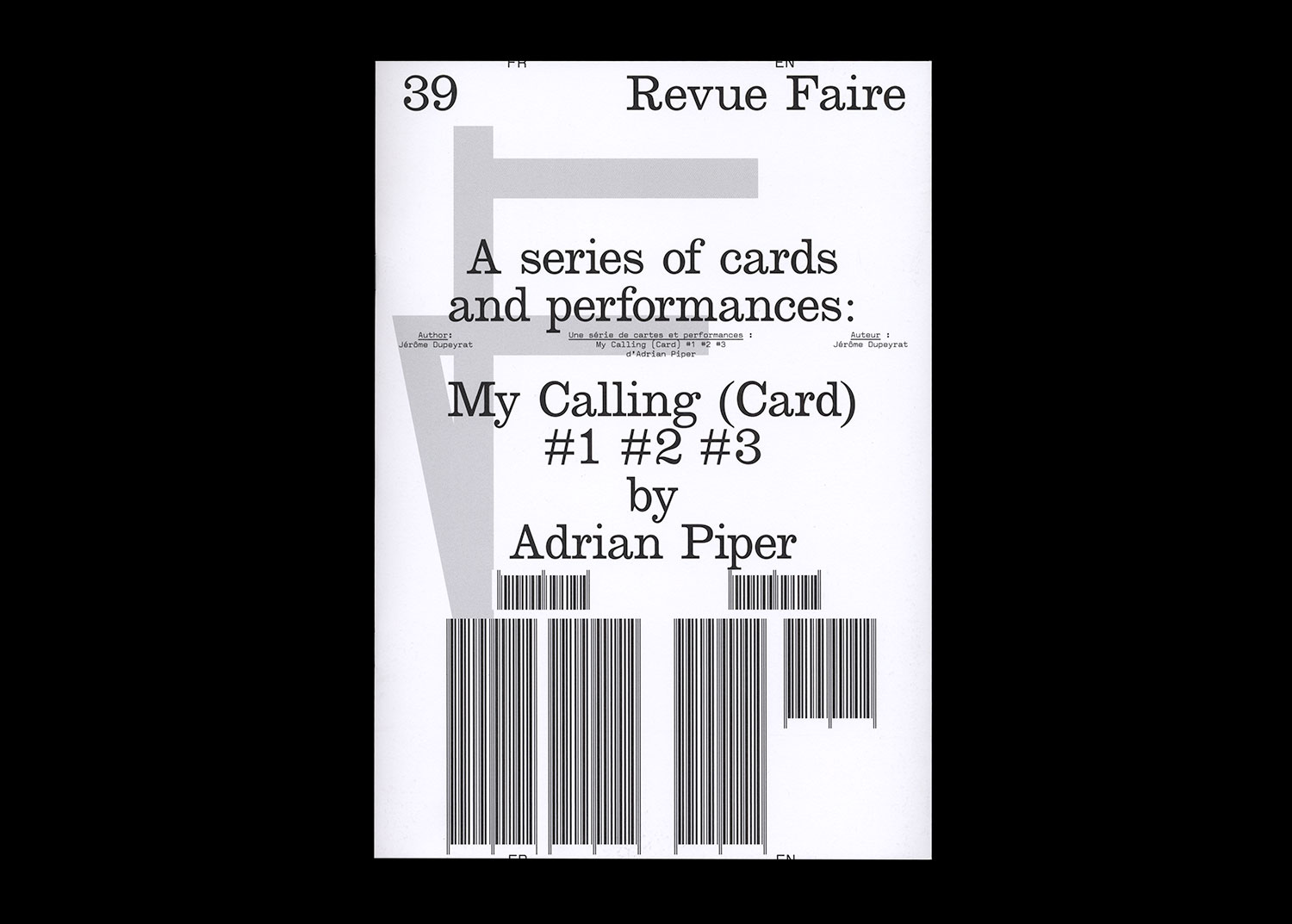 My Calling (Card) #1 #2 #3 (1986-1990 ; 2012), d’Adrian Piper (née en 1948), est une série d’imprimés au format carte de visite et de performances conçues par l’artiste pour confronter ses interlocuteurs à leurs agissements racistes ou sexistes dans différents contextes relationnels et sociaux : un dîner, une soirée, un bar…