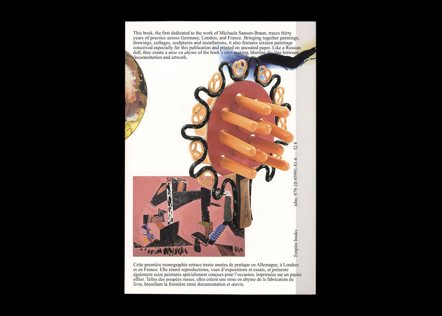 Cette première monographie retrace trente années de pratique en Allemagne, à Londres et en France. Elle réunit reproductions, vues d’expositions et essais, et présente également seize peintures spécialement conçues pour l’occasion, imprimées sur un papier offset. Telles des poupées russes, elles créent une mise en abyme de la fabrication du livre, brouillant la frontière entre documentation et œuvre.
