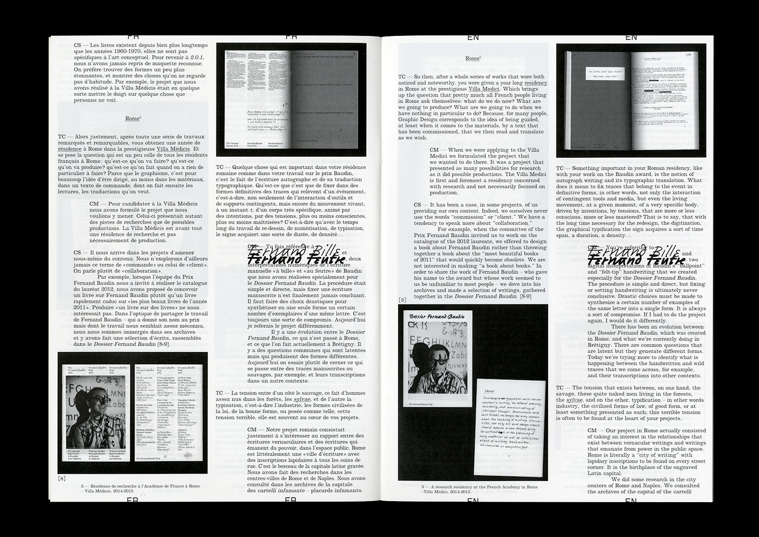When she founded her studio with Charles Mazé, the duo continued the work of collection, which is at the same time one of the etymologies of reading, and one of the characteristics of the conceptual aesthetic of the list that emerged in the 1970s—first, in the re-casting of the Ésad Valence’s identity in 2012-2013; then in the work created during a residency at the Villa Médicis, Come vanno le cose?, dedicated to records of 1,512 graffiti found on the walls of Rome illustrating the portrait of a mysterious survivor, perhaps imagined, of the Red Brigades; and more recently in the identity developed for the Centre d’art contemporain in Brittany.