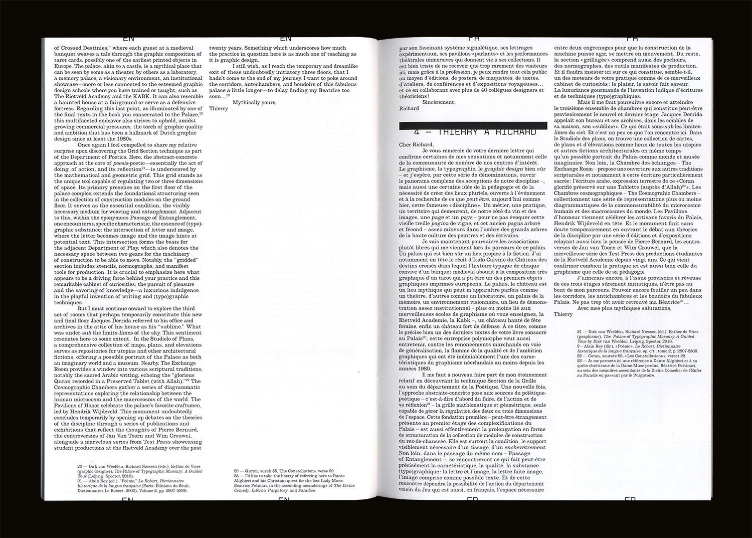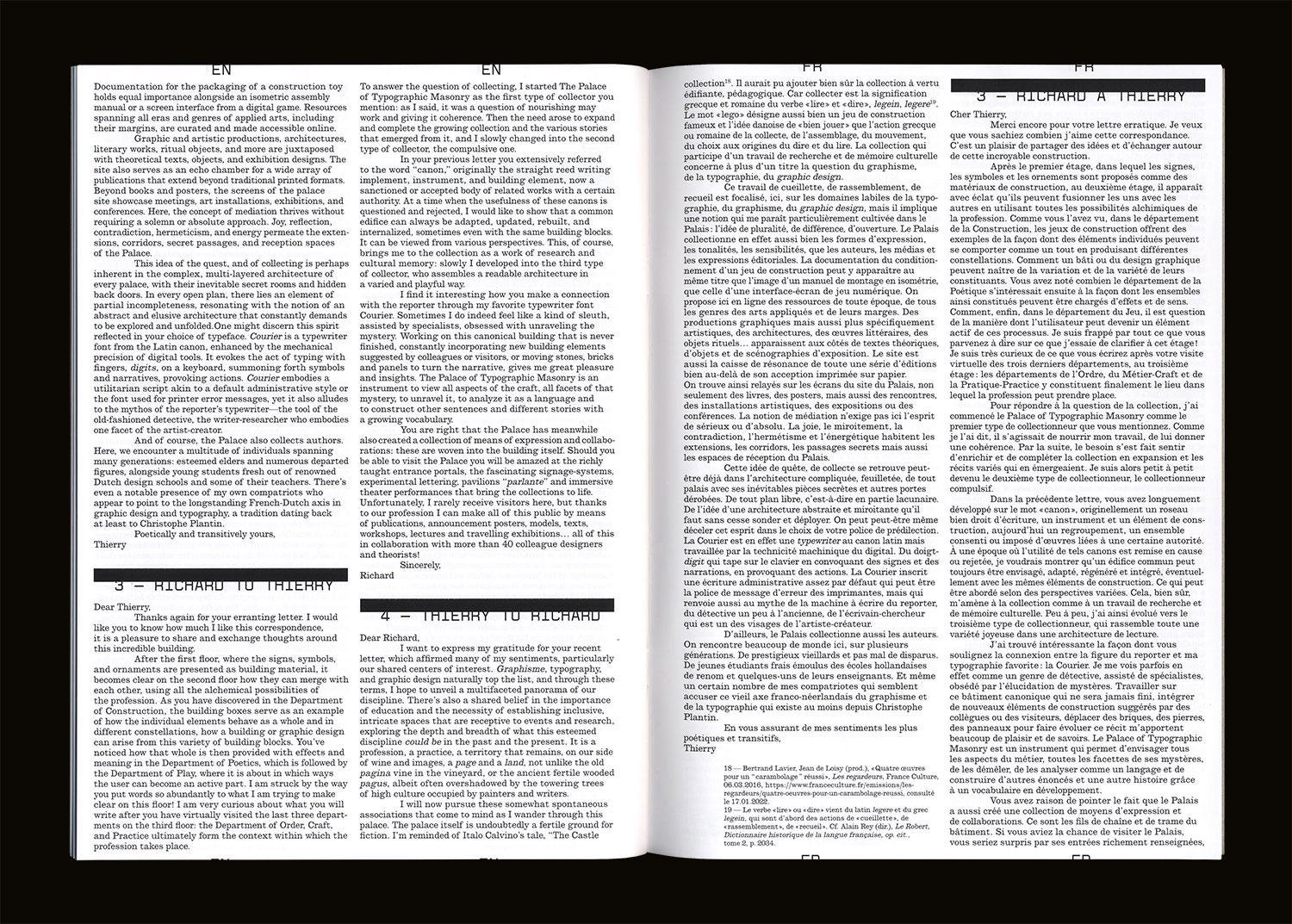 Over the course of four epistolary exchanges, Thierry Chancogne and Richard Niessen have a palatial discussion of the content, issues, and the principles of classification of this palace of “the splendor and variety of graphic languages,” a place dedicated to the promotion, dissemination, and support of an open and adventurous approach to our discipline of graphism, graphic design, and typography.