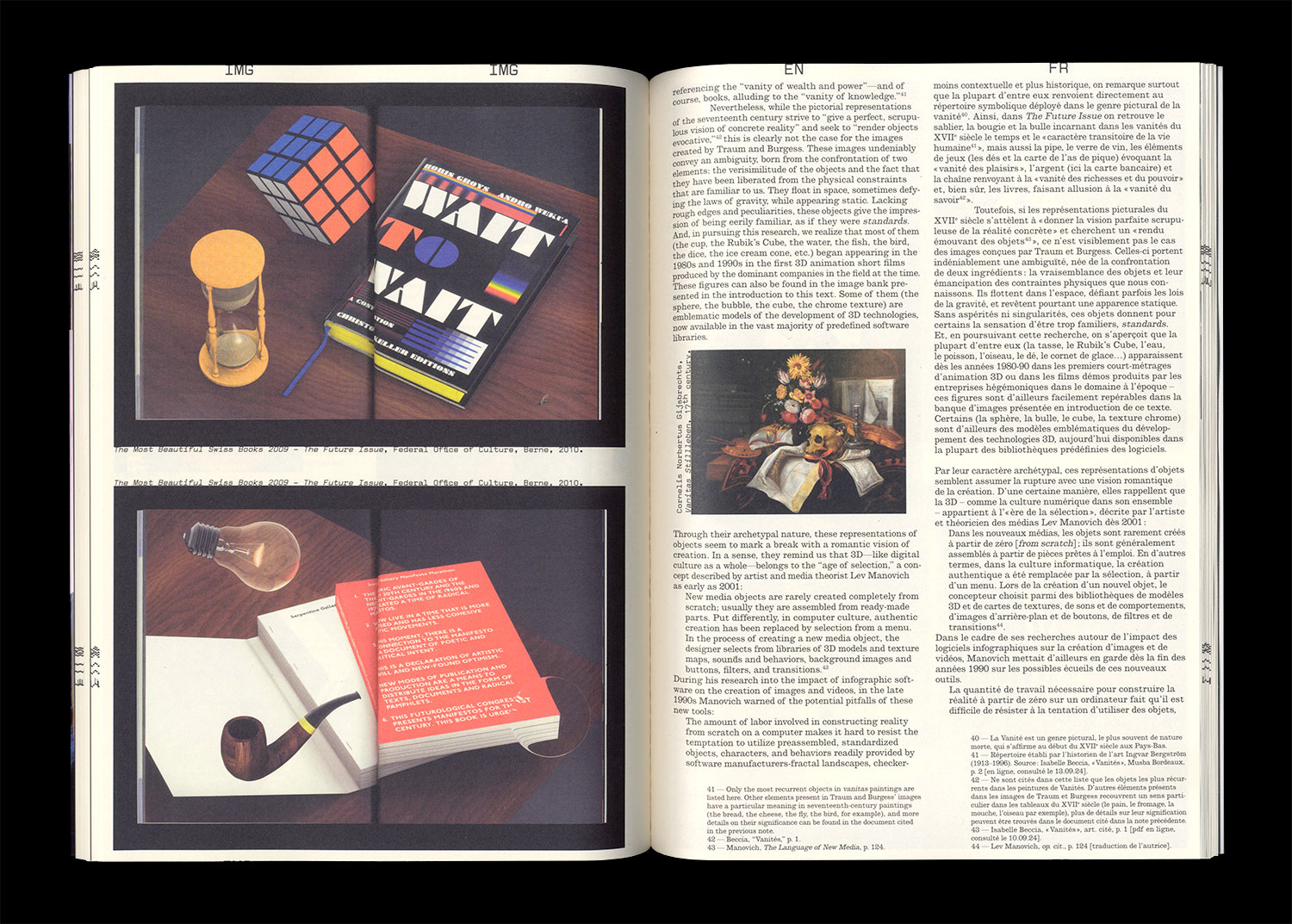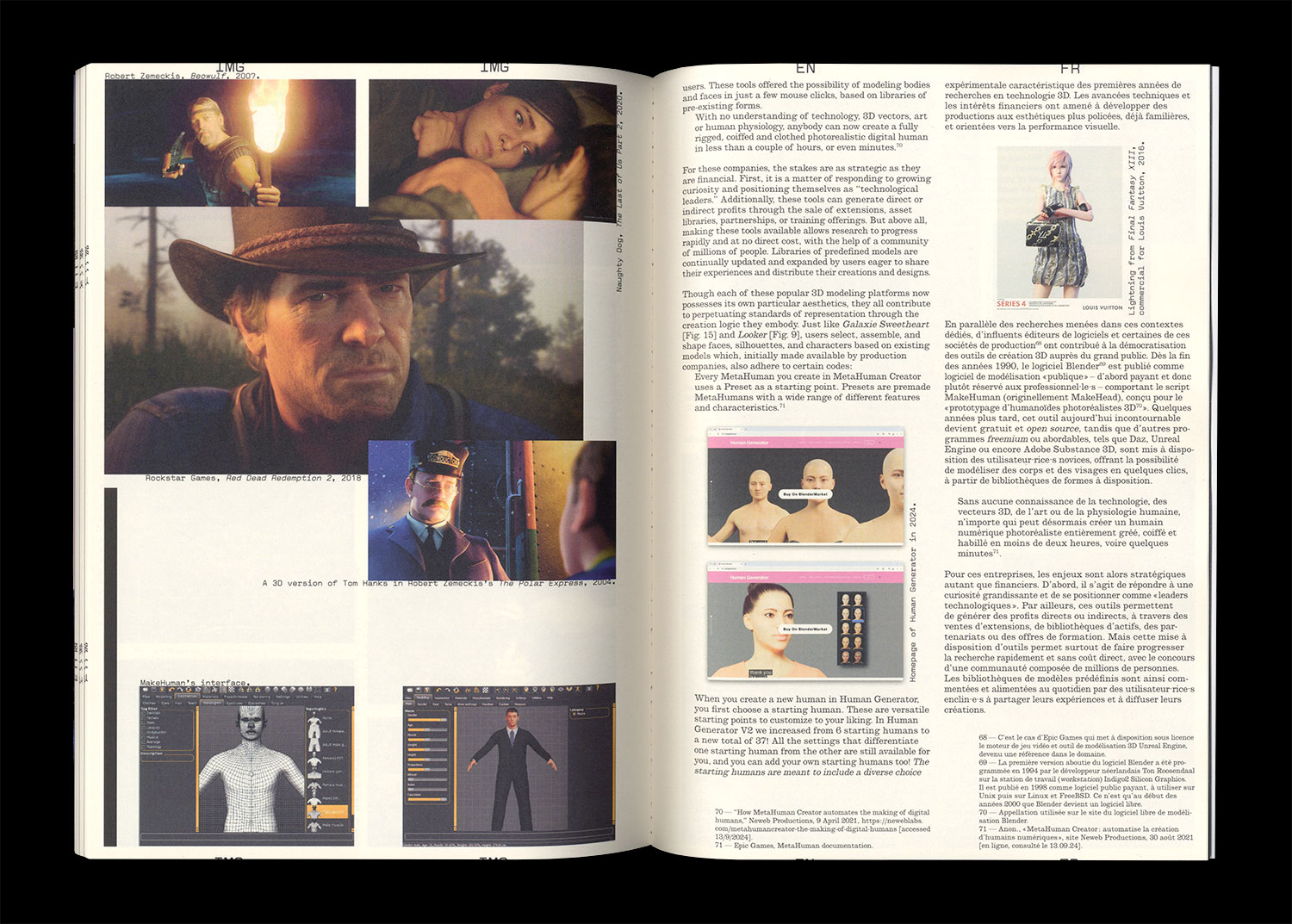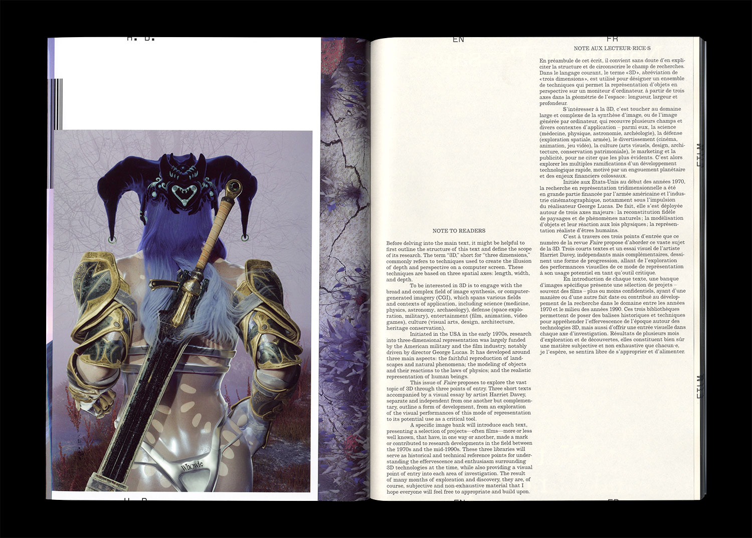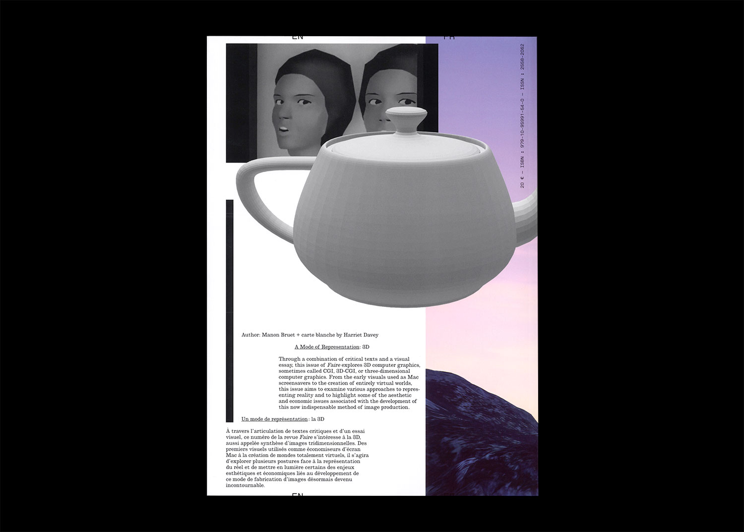 Through a combination of critical texts and a visual essay, this issue of Faire explores 3D computer graphics, sometimes called CGI, 3-D-CGI or three-dimensional computer graphics. From the early visuals used as Mac screensavers to the creation of entirely virtual worlds, this issue aims to examine various approaches to representing reality and to highlight some of the aesthetic and economic issues associated with the development of this now indispensable method of image production.